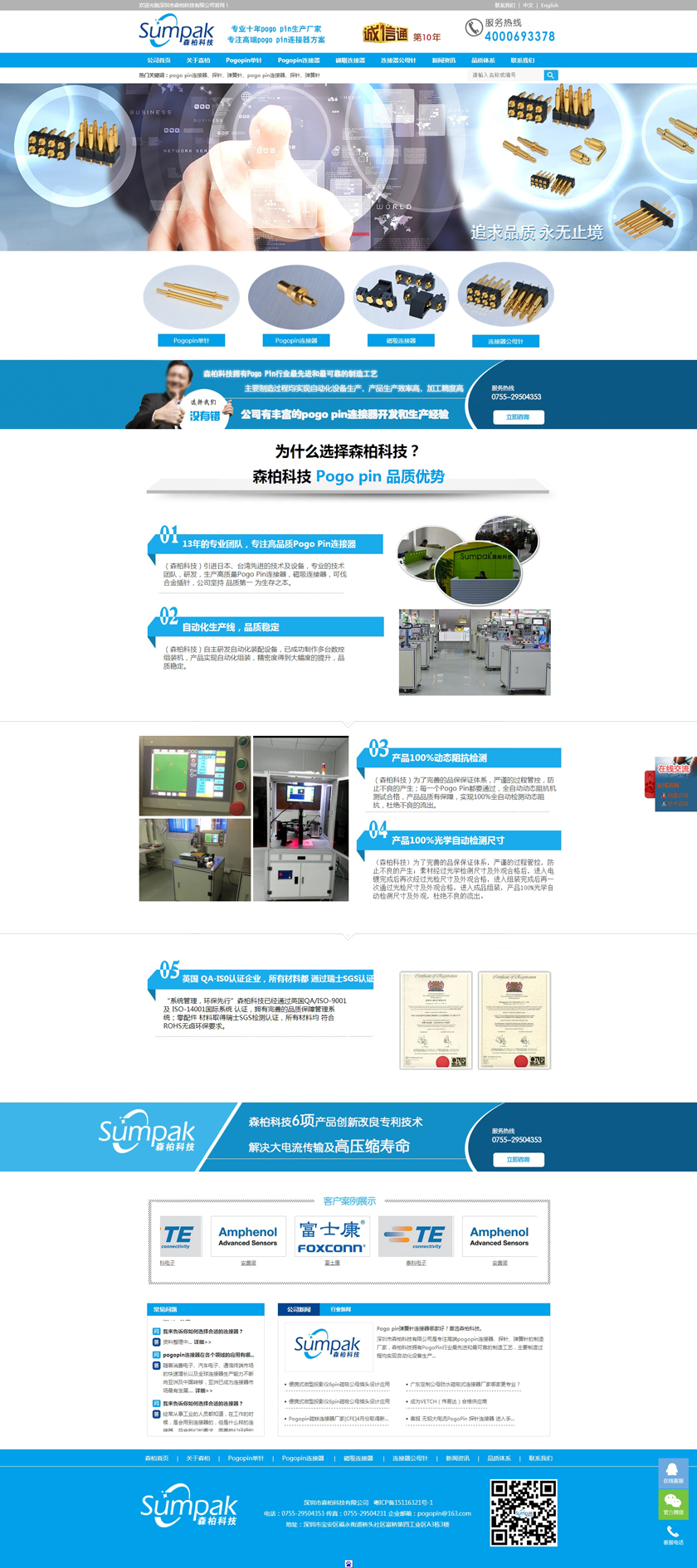 Project Description 深圳市森柏科技有限公司是专注高端pogo pin连接器、探针、弹簧针的制造厂家,森柏科技拥有Pogo Pin行业最先进和最可靠的制造工艺,主要制造过程均实现自动化设备生产,产品生产效率高,加工精度高,重要检测过程均采用自动化快速识别系统,大大降低了人为操作失误的风险,极大的提升了检测效率,工艺过程得到极大的改善和满足。因此产品质量和稳定性获得巨大突破。 Official website address 安康http://www.zgsumpak.com I want to share
